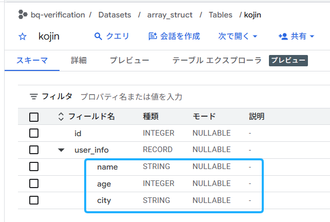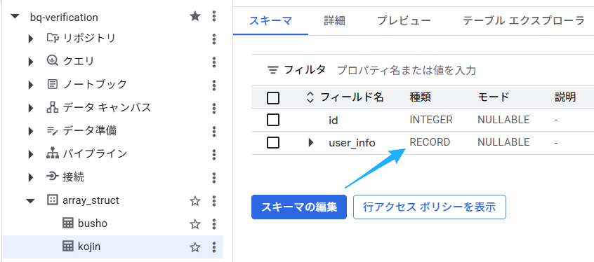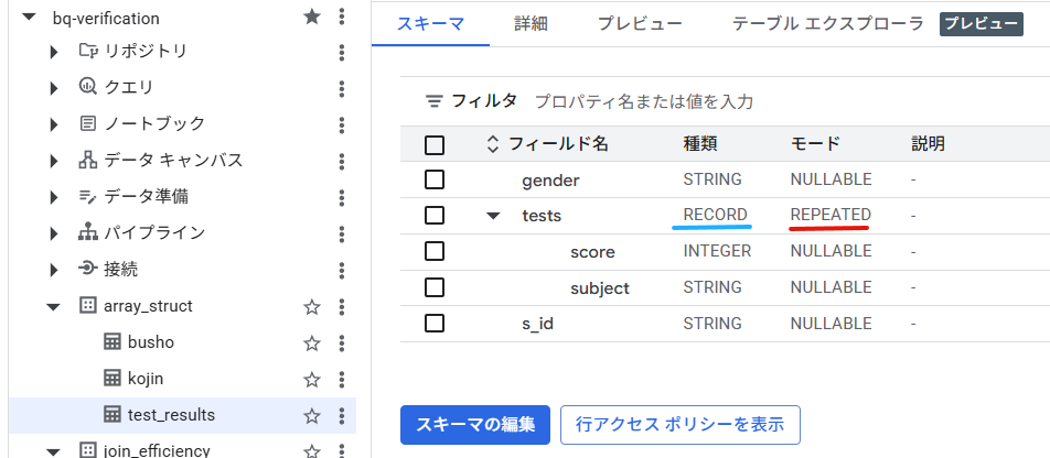 以下が作成したテーブルのスキーマですが、「種類」が「RECORD」、「モード」が「REPEATED」になっているのが確認できます。STRUCT(構造体)、が、ARRAY(配列)に組み込まれていることが分かります。