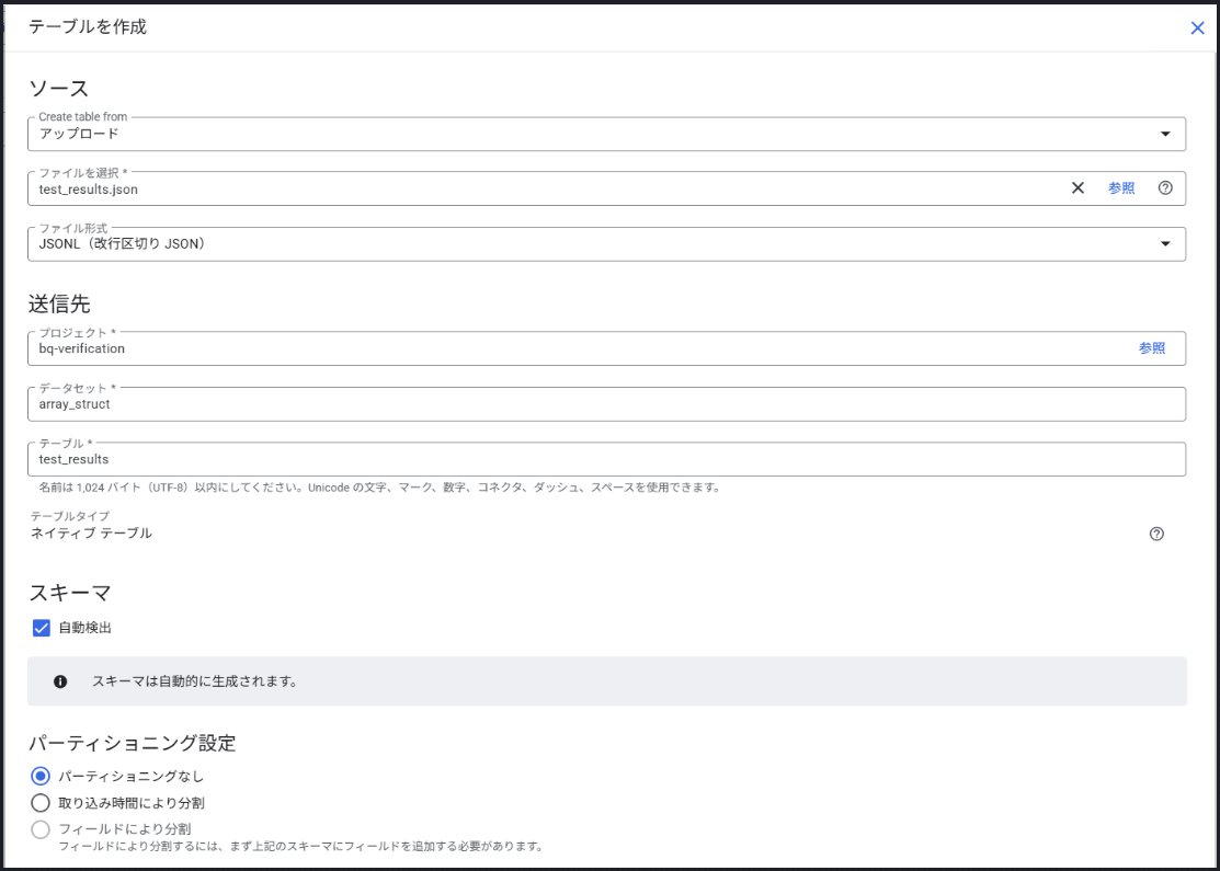 私が、該当のJSONファイルをアップロードしてテーブルを作成している画面は以下の通りです。ファイル形式を「JSONL」、スキーマを「自動検知」にするのがコツです。この画面は、コンソールの左カラムにある、配下にテーブルを格納したいデータセット名の三点リーダーをクリックし「テーブルを作成」に進むと出てきます。