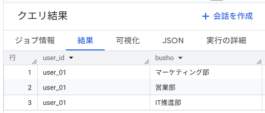 以下の通り、これまで一つのセルの中で縦方向に格納されていた departments の値が、busho列に展開されました。UNNESTという関数で行に展開された1列3行の各行を、FROM句で元のテーブルとカンマでつなぐというのがポイントです。(専門的には「クロスジョイン」と呼びますが、少なくともこの記事においては覚えなくて大丈夫です。)