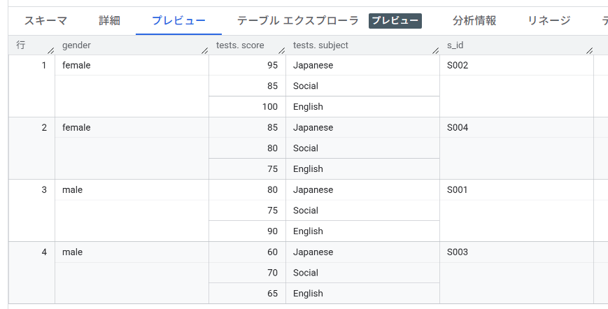 「s_idで識別される1人の生徒(1行)」の中に、「キーと値のセット(STRUCT)」が「複数(ARRAY)」入っていますね。この構造は、GA4がBigQueryにエクスポートしたテーブルの、event_params列そっくりです。