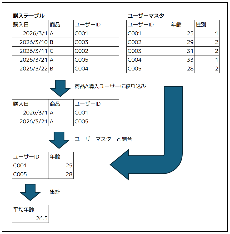 この「当たり前」の世界では、「購買テーブル」(左図)、「ユーザーマスタテーブル」(右図)のように、最初から2つのテーブルがあります。そして、例えば、「この特定商品を買ってくれた人の平均年齢は何歳か?」という問いに対して、2つのテーブルをくっつけて(結合して|JOINして)答えを出す必要があります。