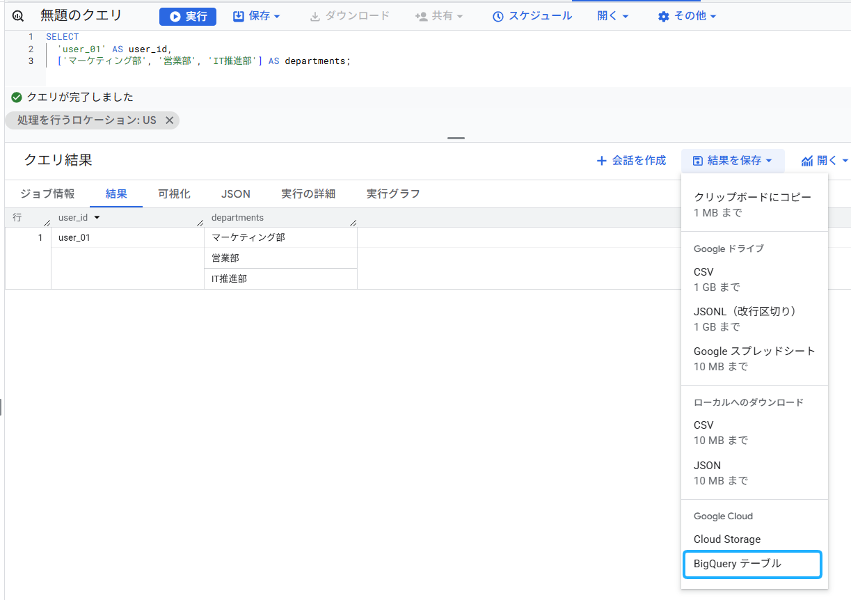 では、この結果テーブルを、BigQueryに格納してみましょう。「結果を保存」をクリックすると「BigQueryテーブル」が出てきますので、プロジェクト(データをまとめる1番大きな単位。ユーザーへの権限付与も、課金もプロジェクト単位で行われる)、データセット(データをまとめるフォルダ)を選択し、テーブルに名前を付けて保存します。私の場合、プロジェクトは、bq-verification、フォルダ名は、array_struct、テーブル名は busho としました。