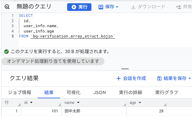 結果は以下の通り、STRUCTの中の、nameとageを取得することができました。STRUCTから、その配下の列を取得するのは難しくありませんね。