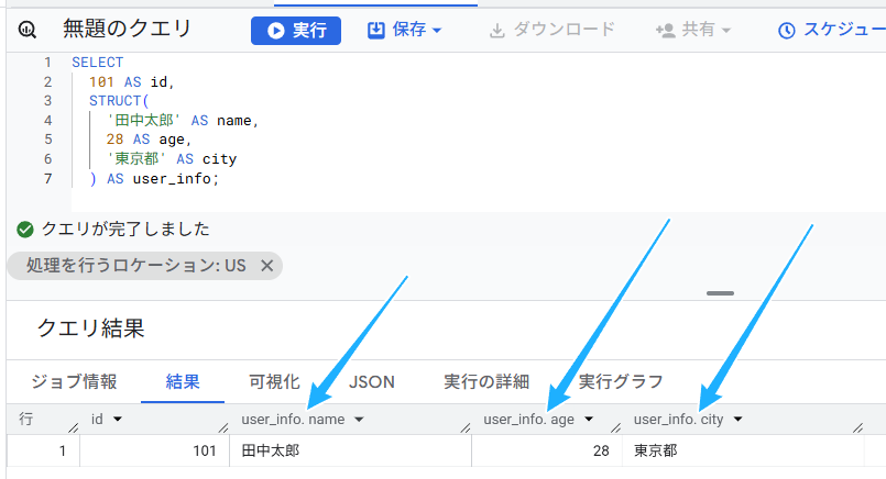 コンソールで、以下のクエリを実行してみてください。STRUCTの中身を見ると、構造上、name=田中太郎、age=28、city=東京都を表していることが分かります。このような「名前=値」という記述方法を「キーバリューペア」と呼びます。