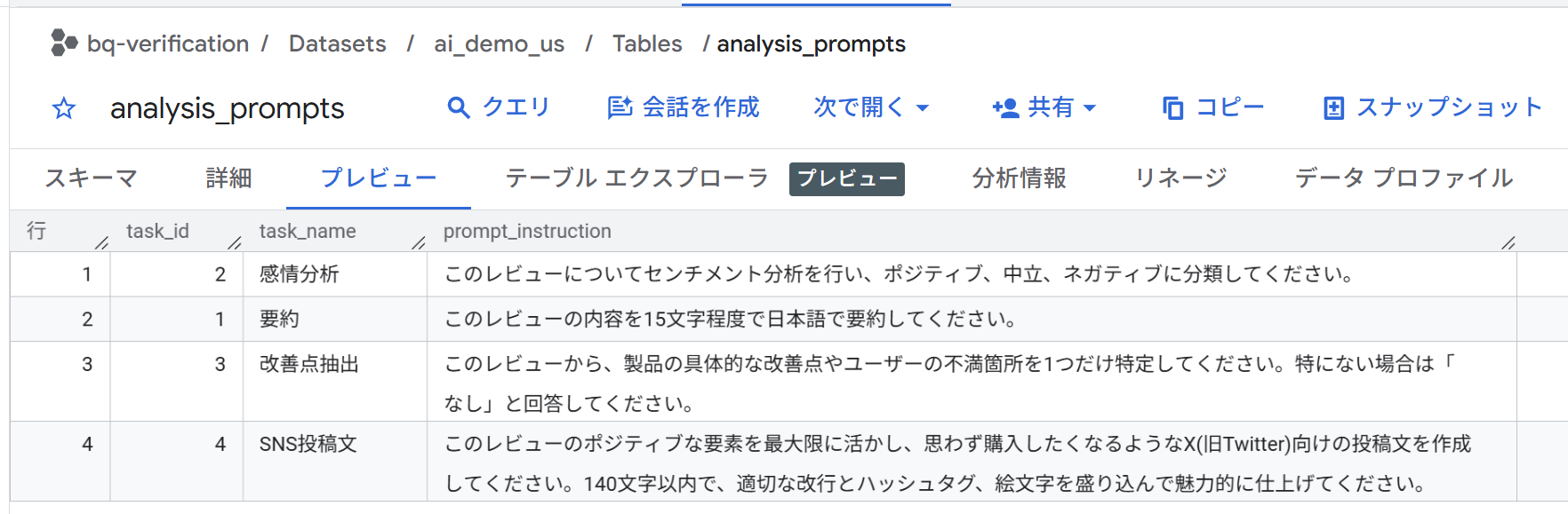 - データとプロンプトの完全分離: 前回の記事では、プロンプトはクエリ(SQL文)の中にハードコードしていました。そのため柔軟性がなかったです。今回の記事では、指示内容(プロンプト)をテーブル化することで、さまざまなプロンプトを同一のデータに対して投げることができます。