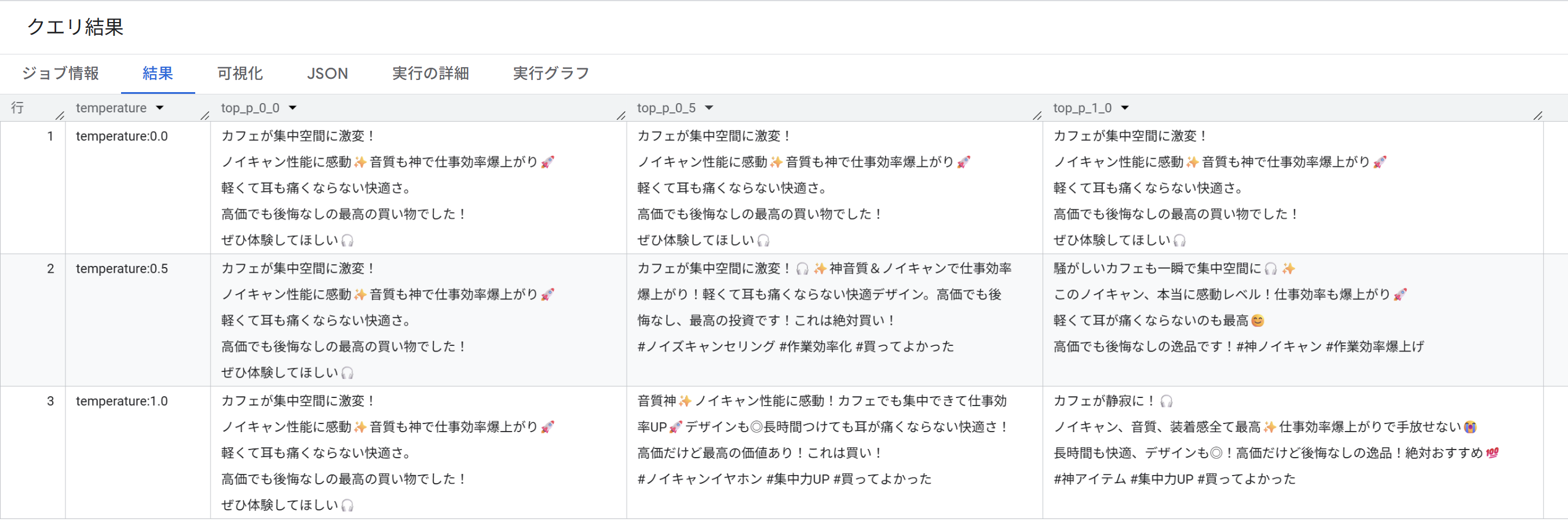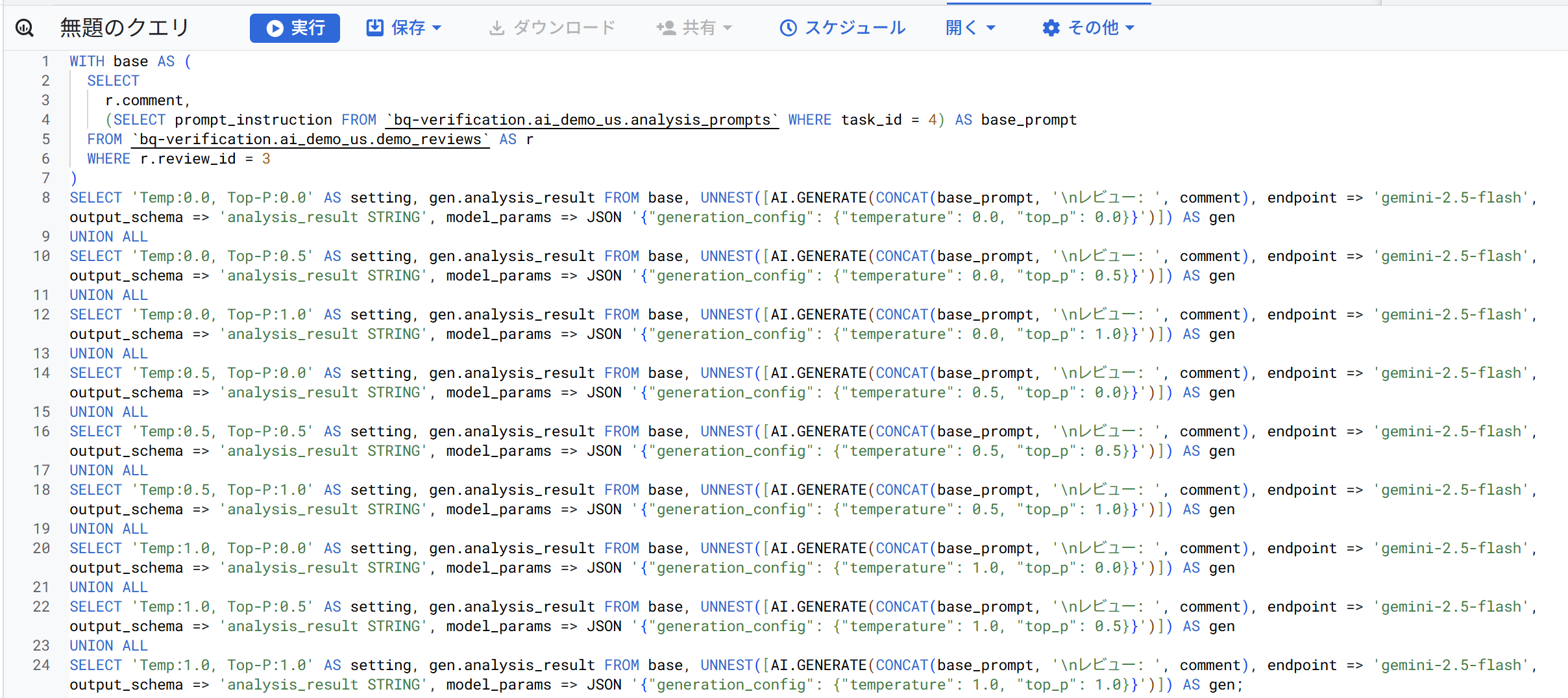 あまり美しくない、いかにも「力技」なクエリですが、temperatureやtop-pといったパラメータは、レビューのデータやプロンプトのようにテーブルで与えることはできず、1回のGemini呼び出しに対し、固定で指定する必要があるので、この書き方となりました^^;