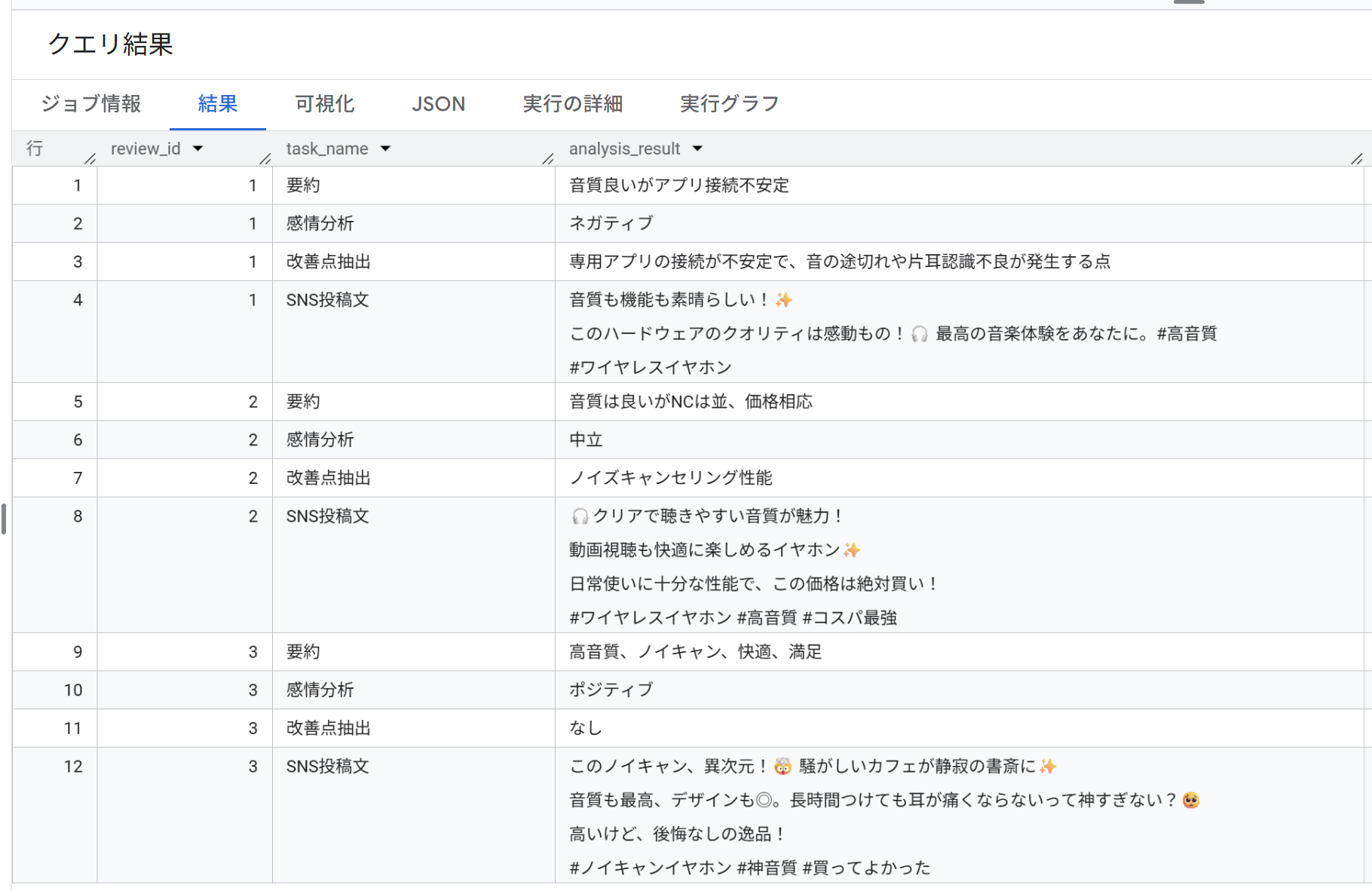 以下がクエリを実行した結果です。このように、1つのレビューに対して4つのタスクが走り、それぞれの結果が縦に並びます。もちろん、クエリにWHERE句を追加すれば、review_idやtask_nameでの絞り込みは簡単にできます。こんな使い方はブラウザからGeminiを利用していたのではできません。