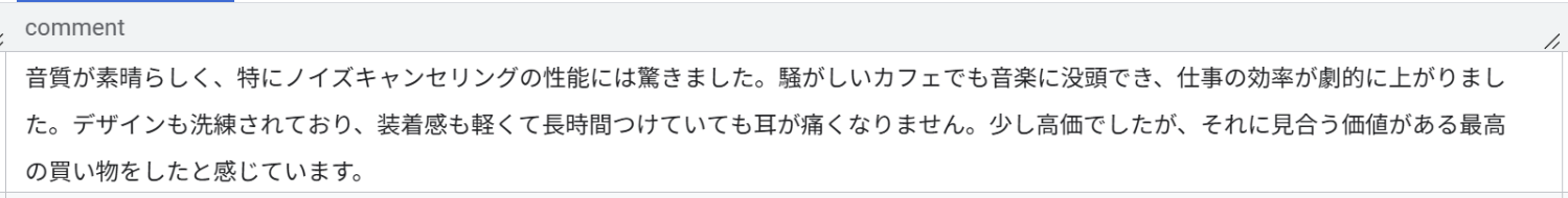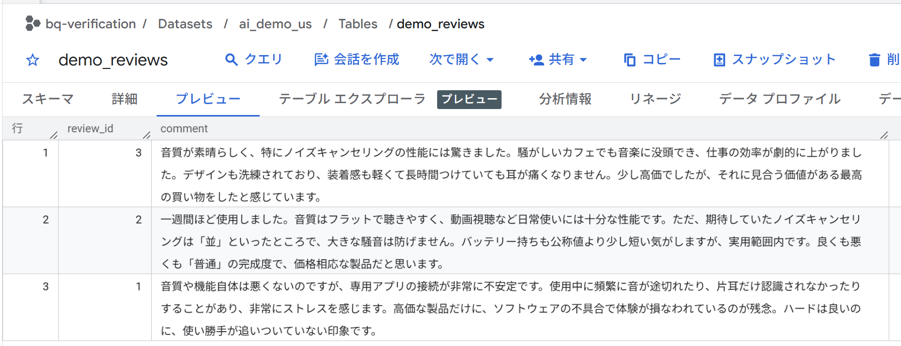 対象となるレビューデータ(demo_reviews)は、以下です。紐付け用の review_id を付与しておくとあとから絞り込みに使えるので、便利です。
