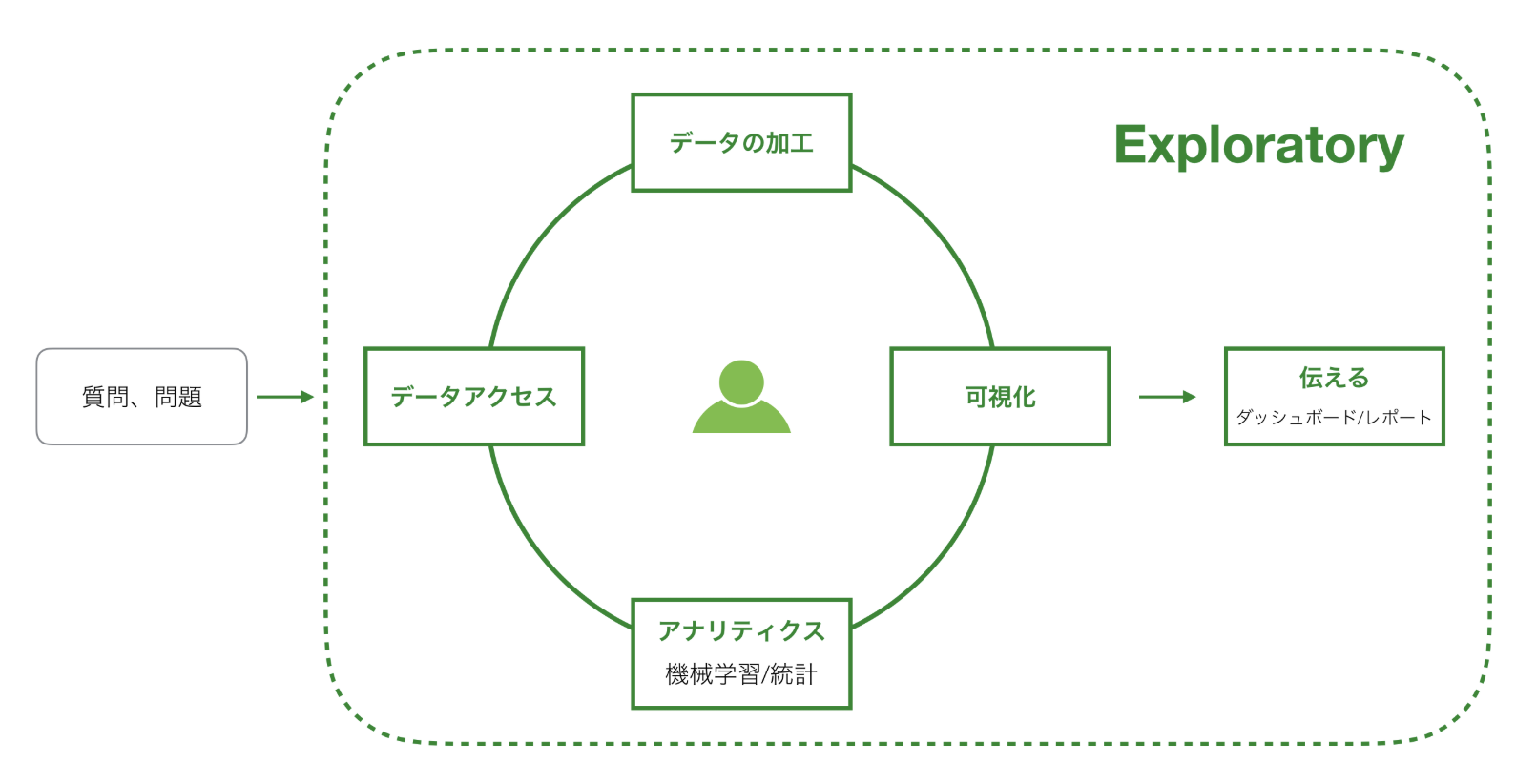以下が、同社のトップページにあるイメージです。点線で囲まれたところが、Exploratoryがカバーしている領域を示しています。この記事を読んでいる方は、Tableauに触れたことのある方が多いと思います。Tableauにたとえて言ってみれば、Tableau Prep Builderと、Tableau Desktopが一体化したツールと考えると良いでしょう。