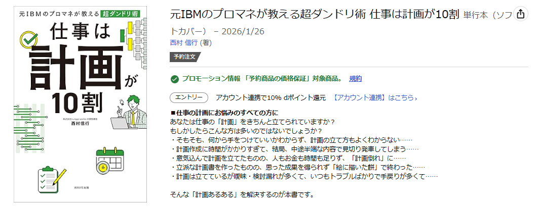 同じUdemyの講師仲間の西村さん(日本IBM→リクルート→日本IBM)の初の著書「仕事は計画が10割」をご恵贈頂きました。1月26日発売です。現在、アマゾンで予約できます。すごく勉強になったので、レビューという形で紹介します。