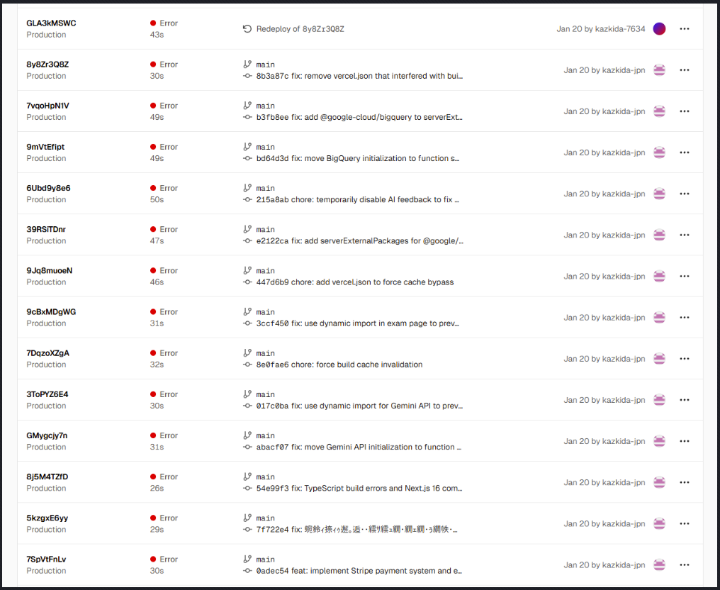 以下は、デプロイ(Vercelという、アプリをホスティングしてくれているサービスのサーバーに、修正したコードを送り込んで、アプリとして実行可能な状態にする作業)のログなんですが、何度も、何度もエラーがでています。デプロイが成功しない。ということはアプリとして動かない。ということです。