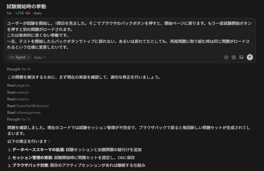 「どのように解決するか?」については、私は指示していません。実際、どうやるかは分からないからです。でも、何が正しい挙動なのかは分かっているので、それを伝えていますね。すると、Cursorがよしなに修正してくれる。というわけです。
