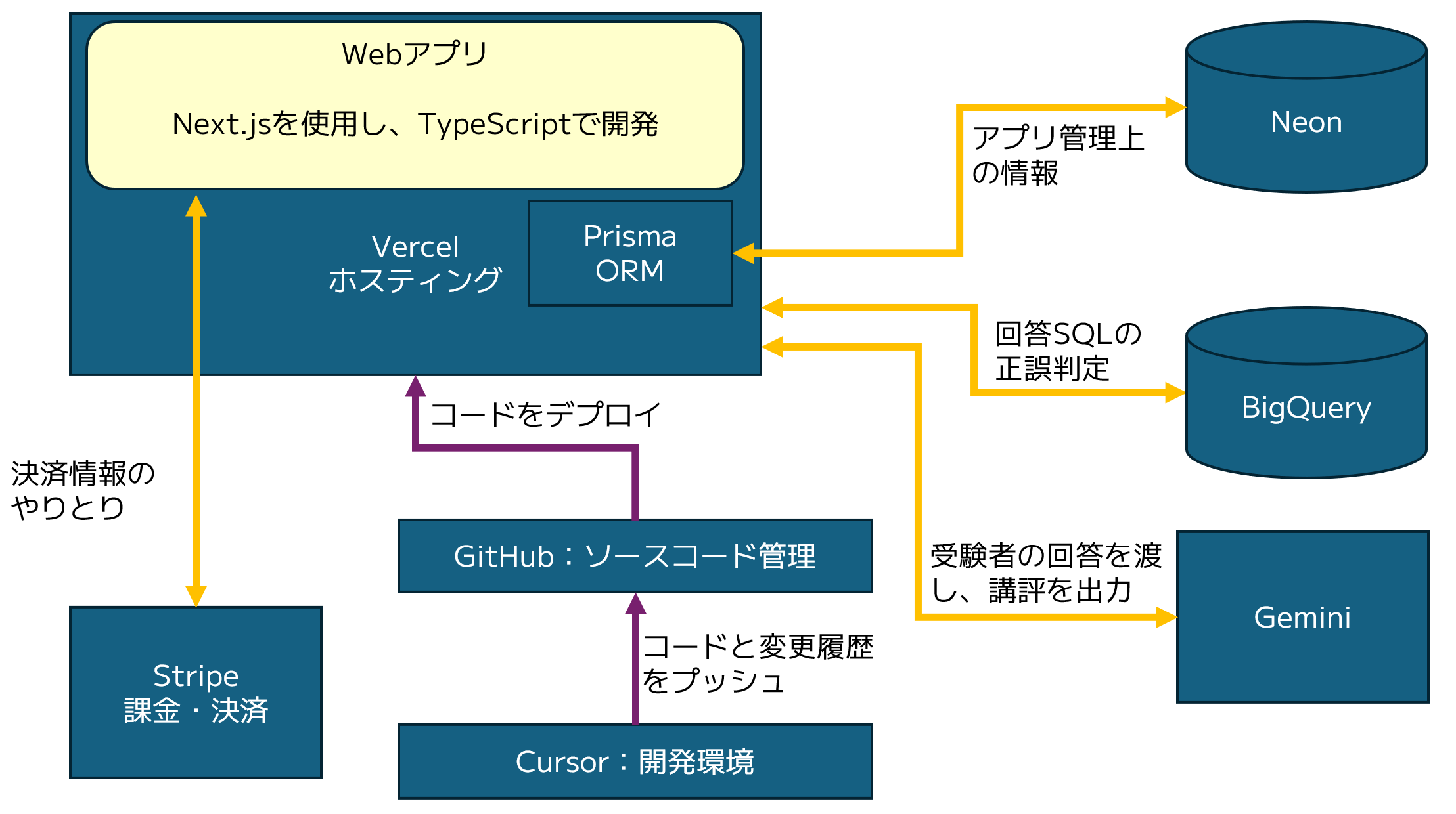 • 講評生成(AI):Google Gemini(受験生の回答SQL・設問・正解SQLなどを入力として渡し、回答内容に応じた講評文を生成して返す)
