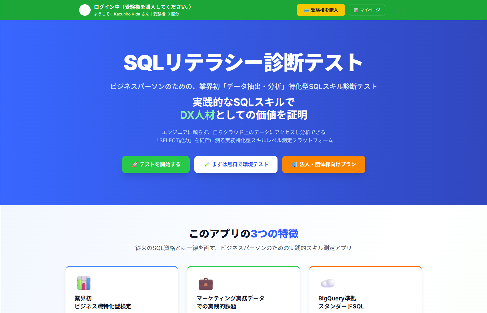 3`週間ほどで完成したのが、以下のアプリです。マーケターとしてのSQL記述スキルをテスト形式で診断できるアプリです。