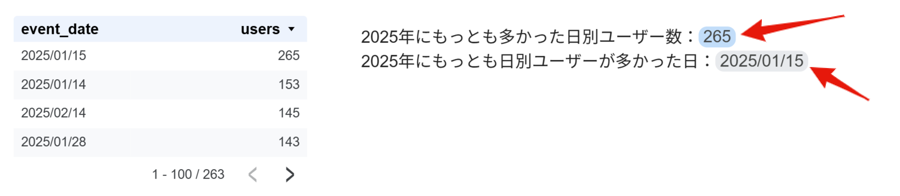 データソースに対して、「データソース上、日別のユーザー数で、もっとも大きな値は何?」と問い合わせし、データソースが、「それは、265人です」と返してくる。そんなイメージを持つと良いです。