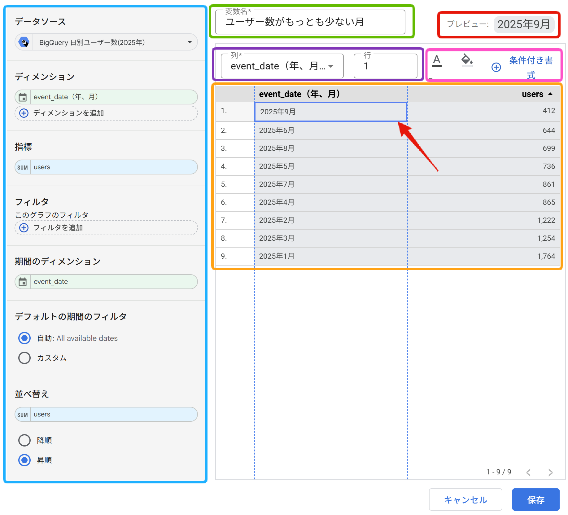 水色枠の設定を見ると、ディメンションや指標(の種類や集計方法)を自由に設定できること、フィルタと並べ方をコントロールコントロールできることがわかります。さらに、紫色枠で任意のセルの値をクエリ結果変数に取り込めることがわかります。それら2つの組み合わせで任意の値をクエリ結果変数に取り込むことができます。