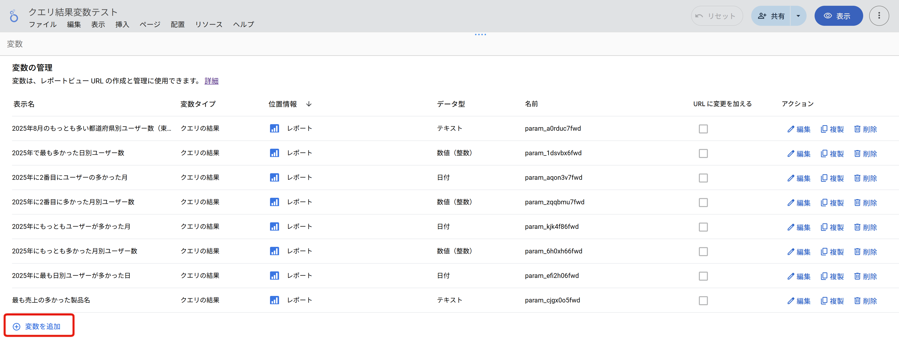 すると、作成済みの変数の一覧が出てきます。このページからは、作成済みのクエリ結果変数について編集、複製、削除ができます。