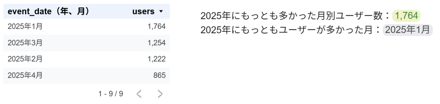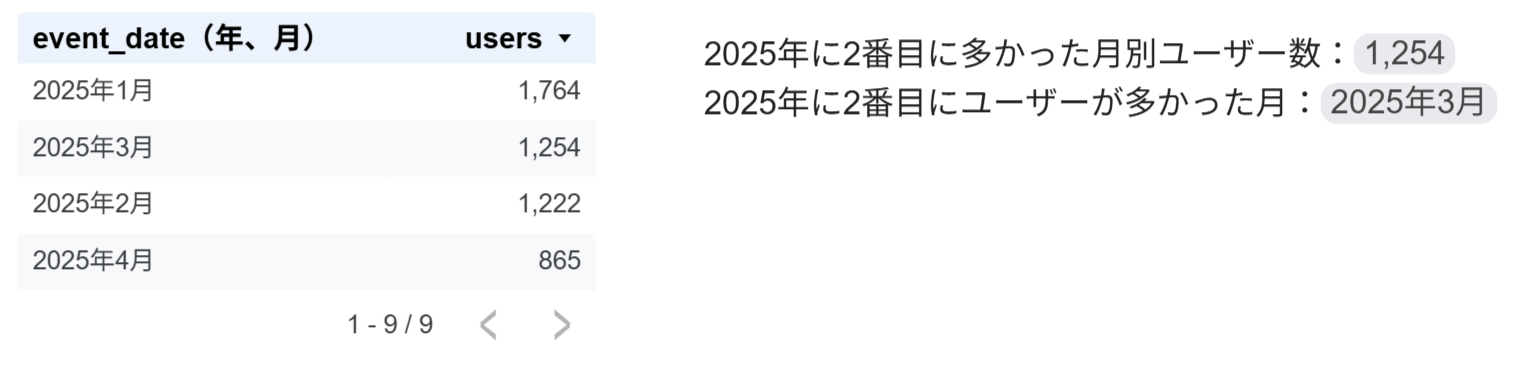 以下の図は、月別ユーザー数について「2番目」を指定して取得しています。左の表は検算用です。テキストに挿入してあるクエリ結果変数とは無関係なので、表示しなくても全く問題ありません。