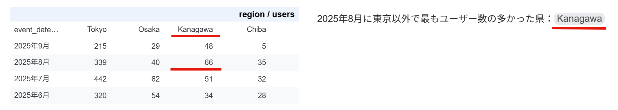 以下の図を見てください。データソースに「2025年8月に一致する」と「regionがTokyo以外」の2つのフィルタを適用して取得した「もっともユーザー数の多かったregion」をクエリ結果変数として取得したものです。表で検算できる通り、正しく「Kanagawa」が取得できてます。